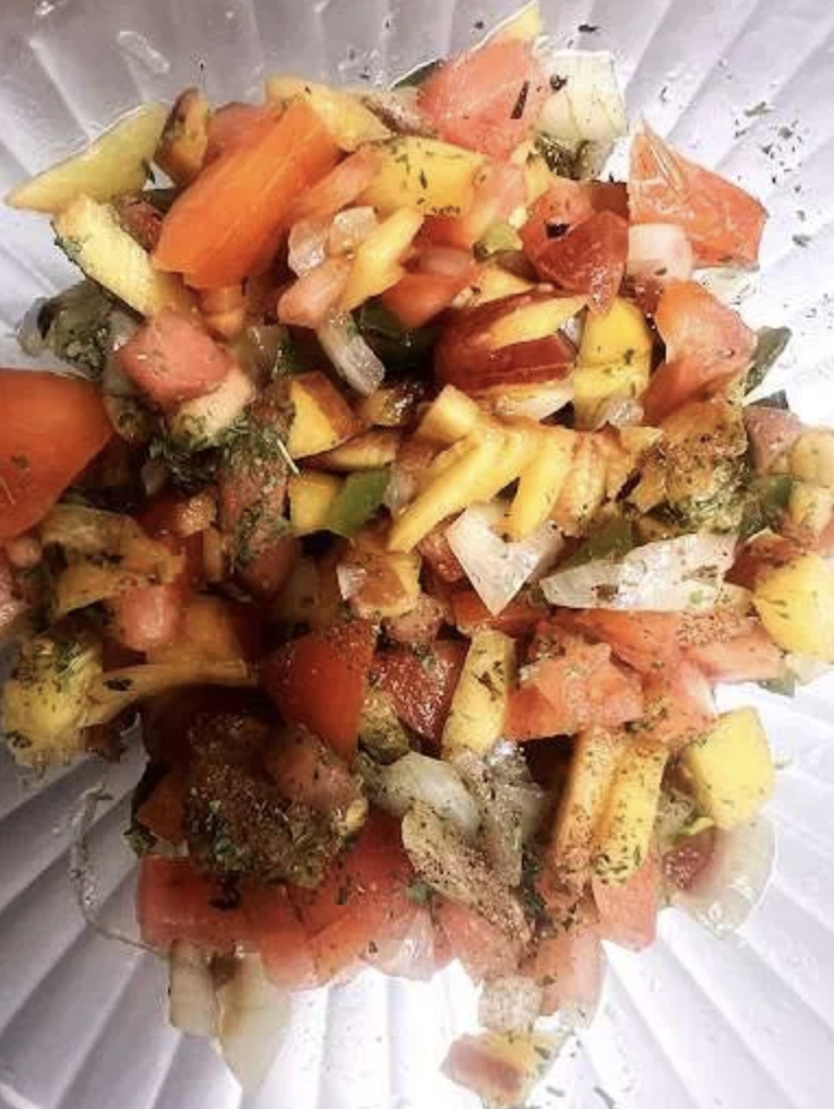 When dicing peaches and tomatoes, you’re going for cubes about a quarter-inch or less. This can be challenging, as slices tend to fall away or stick to the knife as you go. Make dicing easier by first halving your fruit, resting it on its cut side, and starting your cuts with a sharp knife on one end. Tuck those fingers out of the way! Make your slices close together, and almost all the way through. This keeps those slices in place while you make your cross-cut. Finish your dicing process by cutting off the bottom part and dicing it up along with any larger pieces.
